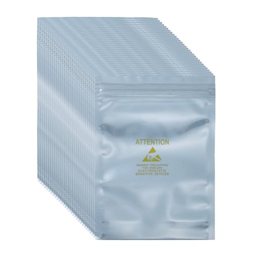 uxcellの防静電バッグは100枚入りで、サイズは3.9″×5.9″。再封可能なESDシールドバッグで、HDD、SSD、電子機器、マザーボード用に最適。シルバーグレーのデザインで、ラベル付きです。