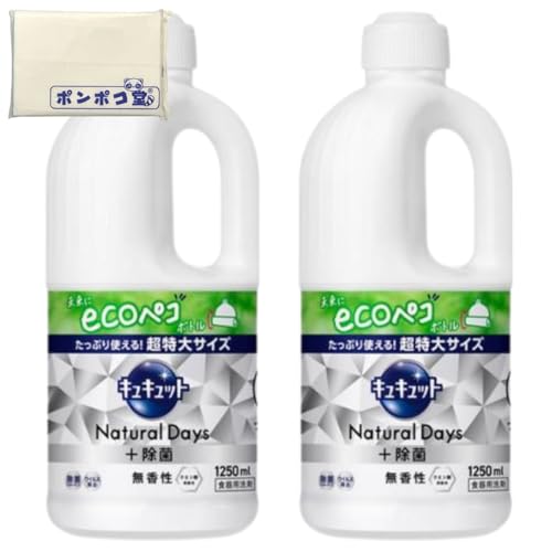 キュキュットの超特大詰め替え用洗剤1250mlが2本セット。食器用で大容量、キッチンでの使用に最適。無香性で、ポンポコ堂オリジナルポケットティッシュ付き。