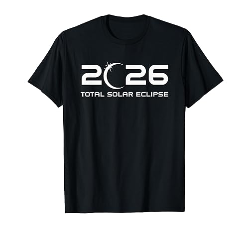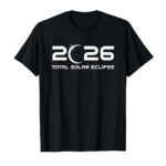 2026年の総太陽日食をモチーフにした天文学Tシャツです。ユニークなデザインで宇宙ファン必見。高品質な素材使用で快適さも考慮。日食イベントを楽しむ際のお供に最適。