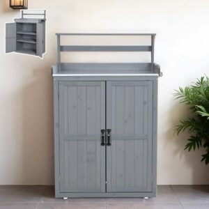 Simpolu 収納庫 木製 観音扉 物置き ヨーロッパ風 ガーデニング用品 小屋 戸外収納庫 大型 屋外物置 棚 ベランダ ガーデニング ウッド 園芸用品 庭 倉庫 DIY 頑丈 (グレー)