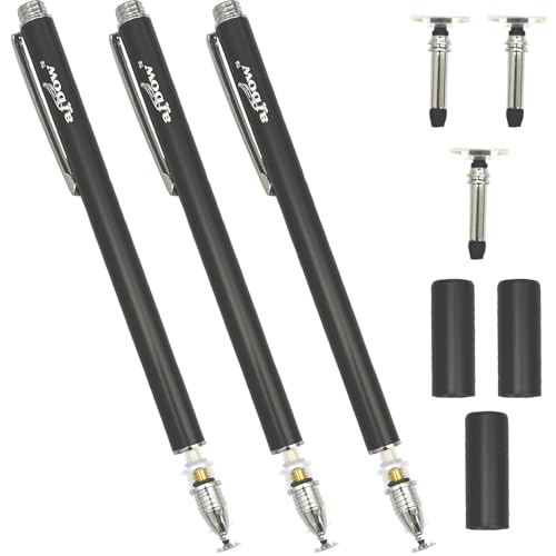 aibow タッチペンは、充電不要でiPad、iPhone、Androidタブレット、Switchに対応。ディスクタイプペン3本(キャップ付)と交換用ディスク3個が付属。ブラック(光沢無し)デザイン。