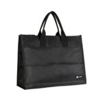 A4サイズの立体ビジネス用トートバッグ。男性・女性向けで、ナイロン製の軽量大容量。7つのポケットを備え、撥水加工。通勤・通学・オフィスに最適な自立型。幅13cm、ブラックカラー。