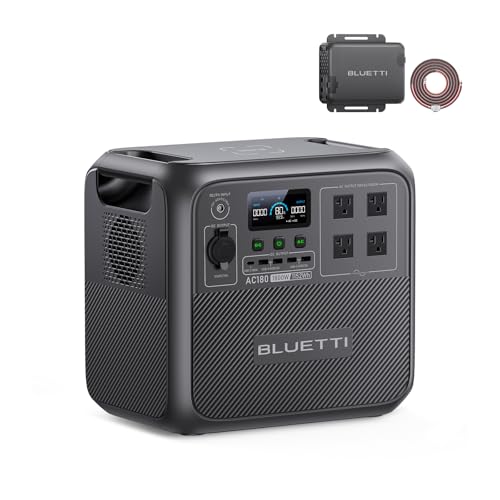 BLUETTI AC180 ポータブル電源は1152Wh、1800W出力で、60分で満充電可能。APP制御、UPS機能、エコモード搭載。家庭やアウトドアに最適な防災アイテム。