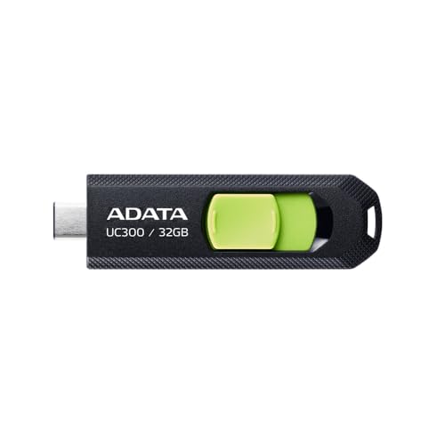 エイデータのUSBメモリUC300は、32GBの容量を持ち、USB 3.2 Gen1に対応。最大読込速度は100MB/秒で、スライド式デザインが便利です。カラーはブラック/グリーン。