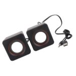 AcoutoコンピュータースピーカーはUSB接続で、3.5mmジャック対応の有線スピーカーです。デスクトップやノートパソコン用に設計され、ブラックのプラスチックケースが特徴のバイノーラルスピーカーです。
