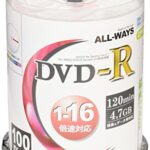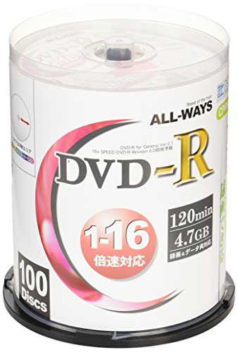 ALL-WAYS DVD-R 4.7GB 1-16倍速対応、CPRM対応の100枚入りスピンドルケース。デジタル放送録画対応、インクジェットプリンタでのワイド印刷が可能。
