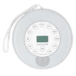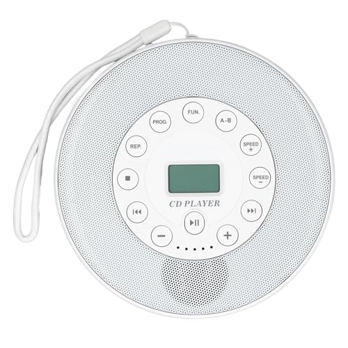 ポータブルCDプレーヤー、スピーカー内蔵、アンチスキップ機能付き。メモリープレイ、AUX 3.5mm入力、充電式でCD、CD-RW、MP3対応。カラーはホワイト、Bluetoothなし。