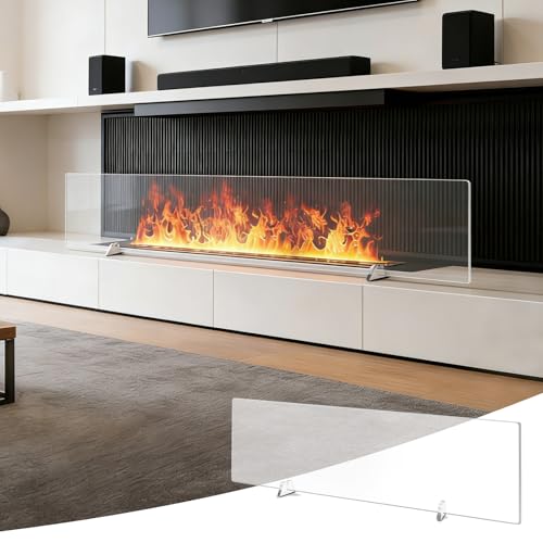 電気暖炉用のプレキシガラススクリーン。サイズは30×8.25×0.25インチ。水蒸気暖炉向けのアクリル製で、風を防ぐ効果あり。厚い透明プラスチックで安全性も高い。