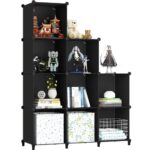 SIMPDIYの棚は大容量で組み立て式。幅300mm、奥行300mm、高300mmの黒色(9ボックス)で、防塵・防水・耐荷重機能を備え、洋服や靴、おもちゃを整理するのに最適な収納ラックです。