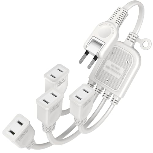 薄型4分岐電源延長コード。2ピンプラグ、短いオス-メス。トラッキング火災予防、絶縁キャップ付き。180°スイングプラグ、4口仕様。15A/1500W、PSE認証、RoHS対応。