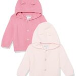 Amazon Essentialsの2枚組ニットフード付きベビーウェア、ダスティーローズとライトピンクの色合い。サイズは85で、快適な着心地を提供し、デイリーのコーディネートにも最適です。