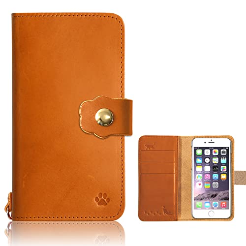 Galaxy 5GモバイルWi-Fi SCR01用の手帳型ケース。キャメルカラーの本革製で、全機種対応。栃木レザー使用、猫デザイン、カードホルダー付き。