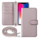 Galaxy 5G SCR01用のシンプルな手帳型ケース。パープルの本革製で、全機種対応。カード収納、スタンド式で横置きも可能。ショルダーストラップ付き。
