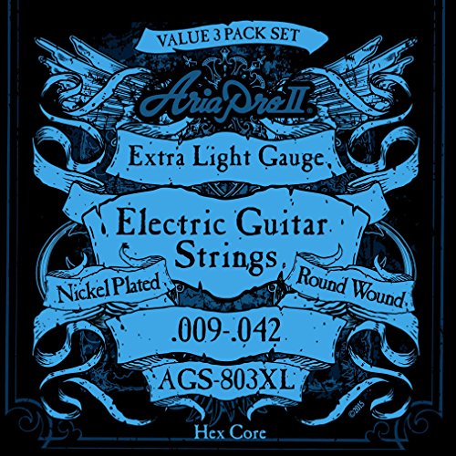 AriaProIIのAGS-803XLは、エレキギター用のExtra Light弦セット(09-42)で、3セットパックです。軽量で弾きやすく、初心者にも適しています。高い耐久性と明瞭なトーンが特徴です。
