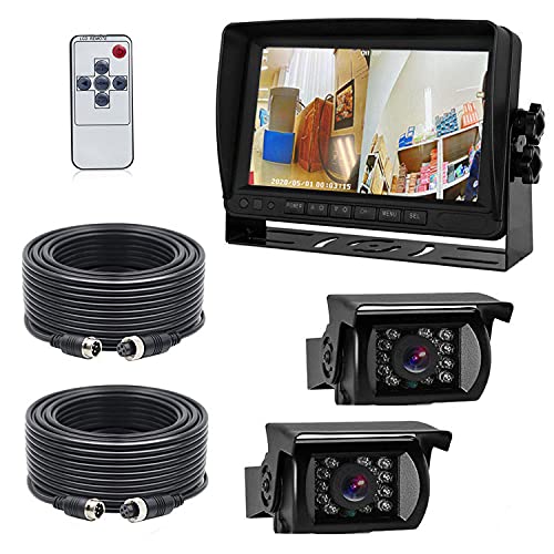 7インチオンダッシュモニター+AHDバックカメラ2台のセット。24V車対応で、4ピン接続。AHDデジタル録画可能、映像入力2系統、暗視機能と防水カメラ付き。電源同軸20m配線付。