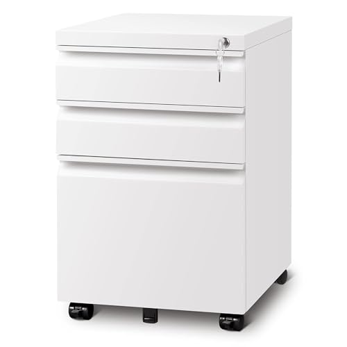 DEVAISEデスクワゴンは、キャスター付きの鍵付3段オールロックキャビネットです。大容量でA4対応、スチール製でサビ止め塗装が施されています。サイズは幅390mm、奥行480mm、高さ600mm。