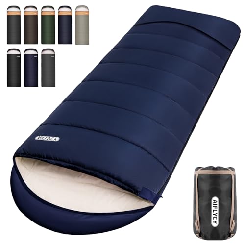 AIFLYCY 寝袋は軽量でオールシーズン使用可能。二重保温設計と230T防水素材で安心。快適温度は-15℃から25℃、丸洗い可能でコンパクト収納袋付き。キャンプや登山に最適。