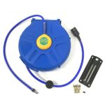 エアホースリール 15m 自動巻き取り式で、壁掛け・天吊りに対応。ストッパー付きの1/4NPTカプラー、内径8mmの高耐圧PUホースは空気圧工具に最適です。