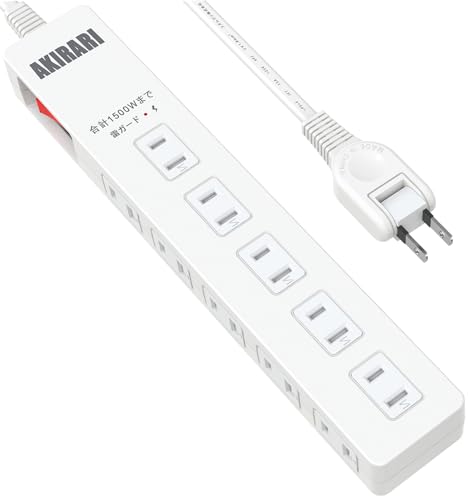 アキラリの電源タップは10個口と1mの長さで、雷ガード機能と一括スイッチを搭載。防塵性能とほこり防止シャッター、180度スイングプラグを備え、トラッキング火災予防にも対応しています。