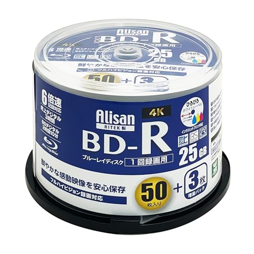 Alisan(アリサン)のBD-Rは、1回録画用の25GBディスク53枚入り。スピンドル仕様で、片面1層、1-6倍速対応。ホワイトレーベルで印刷可能。高品質な映像保存に最適です。