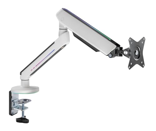 Alterzone ゲーミングモニターアームは、白色RGBデザインで、17~34インチのディスプレイに対応。最大耐荷重9Kg、角度調整可能。グロメット式とクランプ式を選択可能。リモコン付きのシングルタイプ。