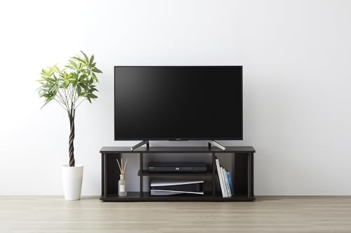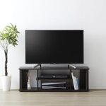 朝日木材加工のテレビ台、atra 50型は幅115cmのブラック仕上げで、木製支柱と縦型収納が特徴です。スタイリッシュなデザインで、テレビやオーディオ機器をスッキリ収納できます。