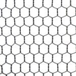 ビニール亀甲金網 ブラック、目開き16mm、#20、線径0.85mm、サイズ455mm×30m。防錆性に優れ、耐久性も高く、様々な用途に対応可能な製品です。