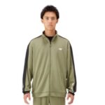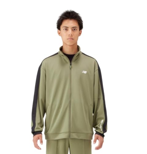 ニューバランスの大谷翔平選手着用モデル、メンズニットトラックジャケット(AMJ51503)。部活やトレーニングに最適なジャージ。吸水速乾機能搭載。カラーはダークオリビン、サイズはSです。