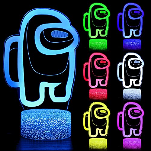 Among Us ナイトライトはUSB充電式のテーブルランプで、タッチ調光機能と16色切替が可能。リモコン付きで簡単操作。3Dイリュージョン効果で部屋の雰囲気作りに最適。誕生日ギフトにも。