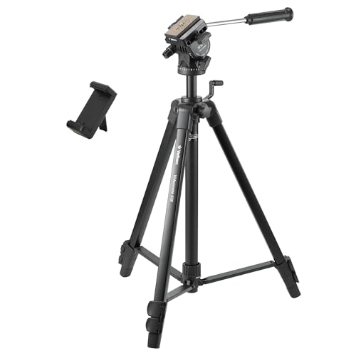 ベルボンの中型ファミリービデオ三脚、ビデオメイト538AZは全高約161cm、3段アルミ製。オイルフリュード雲台搭載で、スマホホルダーと専用ケース付き。動画撮影やVLOGに最適です。