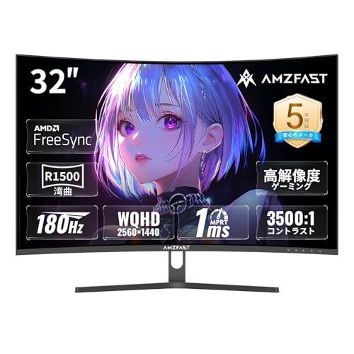 Amzfast 32インチゲーミングモニターは、WQHD解像度(2560×1440)、180Hzのリフレッシュレート、VAパネルを採用。1500R曲面デザイン、1ms OD、Adaptive Sync、フリッカー防止機能、色域DCI-P3 90%、HDR対応。5年保証付き。
