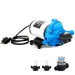 高圧ポンプ、給水・排水可能なダイヤフラムポンプ。電動自吸式で、45PSI・11.6L/minの性能。キャンピングカーやヨット、家庭用に最適。内臓自動圧力スイッチ付き。