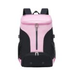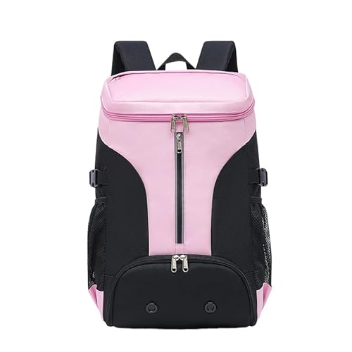 Aoccqkfのスポーツリュックは、メンズ・レディース対応の大容量で防水機能を持ち、シューズやラケット2本を収納可能。多機能ポケットが充実しており、ジム、自転車、旅行、登山、防災、バイクにも最適なピンク色のスクエア型リュックです。