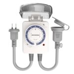 屋外用の防雨型タイマーコンセント。12時間ダイヤルで簡単操作。カウントダウン式で消し忘れ防止。防雨カバー付き、壁掛け穴あり。装飾灯や玄関灯に最適。節電対策にも便利。