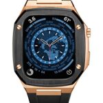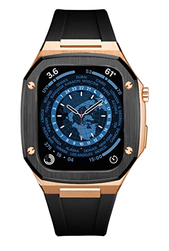 diosbrasのアップルウォッチケースは、ステンレス製でラバーベルトと一体型。Series 9、SE、8、7、6、5、4、3、2、1に対応。カラーはローズゴールド&ブラックラバー、サイズは44mmです。