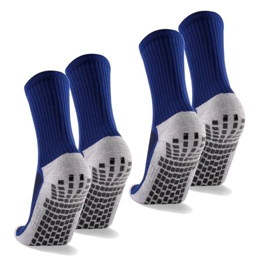 Aqinmonyの2足組サッカーソックスは、メンズ用の厚手で滑り止め粒子付き。綿素材で快適な履き心地、ミッドチューブデザイン。フットサル・トレーニング・アウトドアに最適。サイズ22-28cm、カラーはネイビー。
