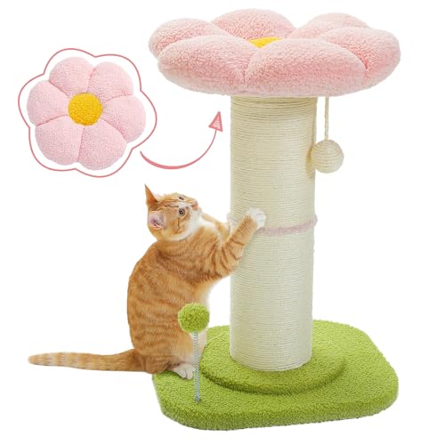 PAWZ Roadの猫爪研ぎキャットタワーミニ。直径14cmの極太柱、低いコンパクトデザイン。天然サイザル麻紐使用でガリガリ、60cm高。おしゃれで可愛いピンク色、組立簡単。人気のポンポンおもちゃ付き。