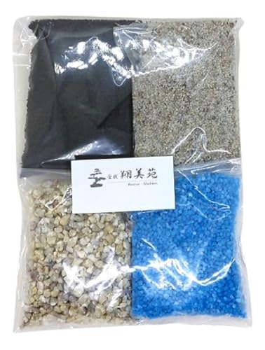 翔美苑の苔テラリウム盆栽用化粧砂利4種セット。B富士砂、珪砂、白川砂、ブルーの4色が含まれ、美しいアレンジを楽しめます。おしゃれなインテリアに最適です。