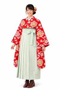 [京都室町st.] 袴セット 卒業式 大学生 二尺袖の着物(長丈) と R・Kブランドの無地袴(Lサイズ)&袴下帯の3点セット「赤、ねじり梅に宝」DNK2419RKM957
