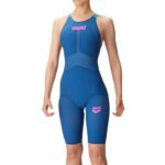 arenaの競泳水着「AQUAFORCE STORM MF」は、レディース用のトップレーシングモデルです。持続性と機能性に優れ、特有のねじり構造が特長です。カラーはD×ブルー(DBLU)です。