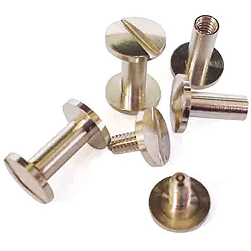 片ネジ式ビス(4×10mm、頭9mm)2セット。真鍮素材にニッケル鍍金仕上げでシルバー色。凹本体、凸ネジ各2個入り。バインダー金具やクリップ金具の取り付けに最適な留め具です。