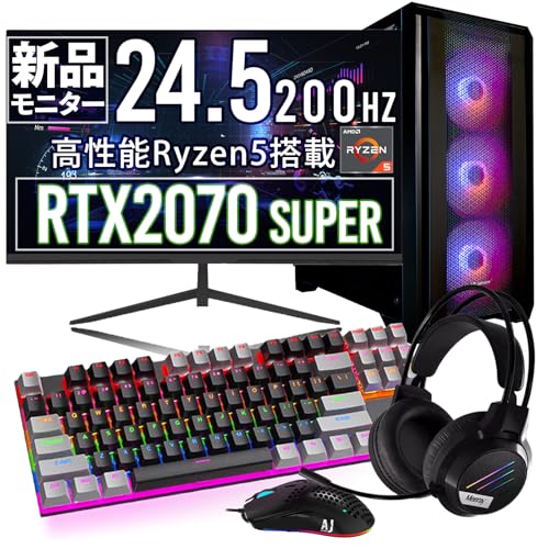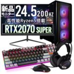 RTX2070 Super搭載のゲーミングPC。Ryzen 5 5500、16GBメモリ、500GB NVMe M.2 SSD、最大4画面出力可能。200Hzモニターセット、Windows 11 Pro、1年保証付き。初心者向けのコスパモデル。