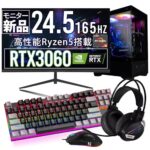 UNFINITYの初心者向けゲーミングPCセット。Ryzen 5 5500、16GBメモリ、RTX3060Ti、500GB NVMe SSD、200Hzモニター、550W電源、Windows11 Pro搭載。1年保証。