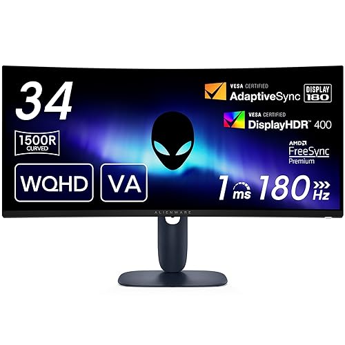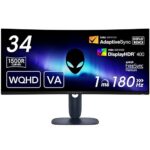Dell AW3425DWM-Aは34インチ曲面ゲーミングモニターで、WQHD解像度、1500R曲面、180Hzリフレッシュレート、1ms応答速度、FreeSync Premium対応。DCI-P3 95%、VESA DisplayHDR 400対応。