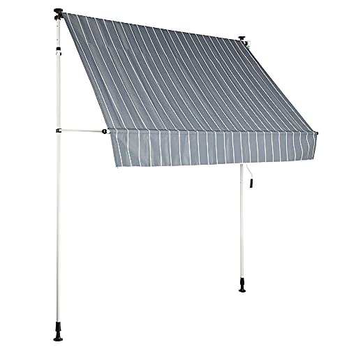 TOMOYASU つっぱり式オーニングテント CALMEは、幅2mのグレーストライプデザイン。防水・撥水機能付きでUVカット効果もあり、日よけや雨よけに最適です。