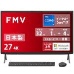 富士通デスクトップパソコン WF2-K1は、27型ディスプレイ、Core i7、32GB RAM、1TB SSD、4TB HDDを搭載。MS Office 2024とCopilotキー付き。Windows 11、スーパーマルチドライブ対応。