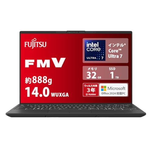富士通 FMV LIFEBOOK WU4/J3は、14.0型ディスプレイ、Core Ultra 7、32GB RAM、1TB SSDを搭載し、Win 11 ProとMS Office 2024に対応。顔認証機能も備える日本製ノートパソコンです。