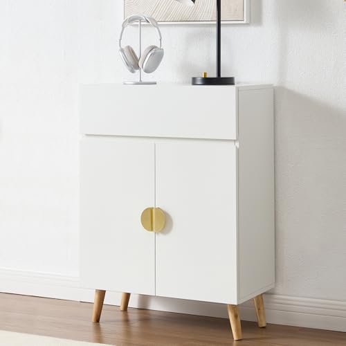 KITHOMEのキャビネットは幅60cmの北欧風デザインで、コンパクトながらおしゃれ。扉と引き出し付き、通気孔もありルーター収納に便利。リビングにぴったりの収納アイテム、ホワイト色。
