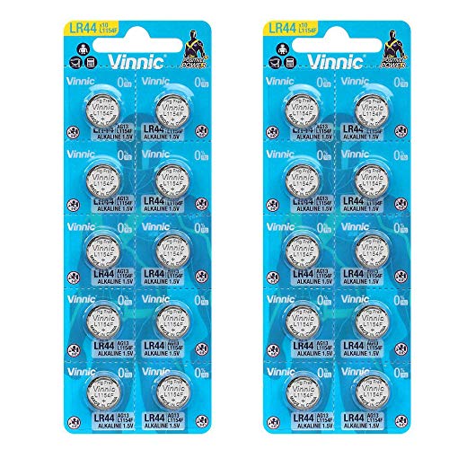Vinnic LR44 アルカリボタン電池は、1.5Vで水銀0%の安心設計。10個入りシートが2枚、計20個。LR44/G13 / L1154F互換、電子機器や玩具に最適です。