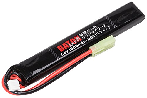 BATONの電動ガン用リポバッテリーは7.4V、1300mAh、40C-20Cのパフォーマンスを提供。スティック型で、M4、AK、ハンドガンなどの電動エアガンに対応。18歳以上対象です。